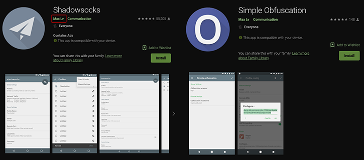 推荐在 Google Play 上下载 Shadowsocks APP, 同时下载 obfs 插件,开发者均为 Max Lv。